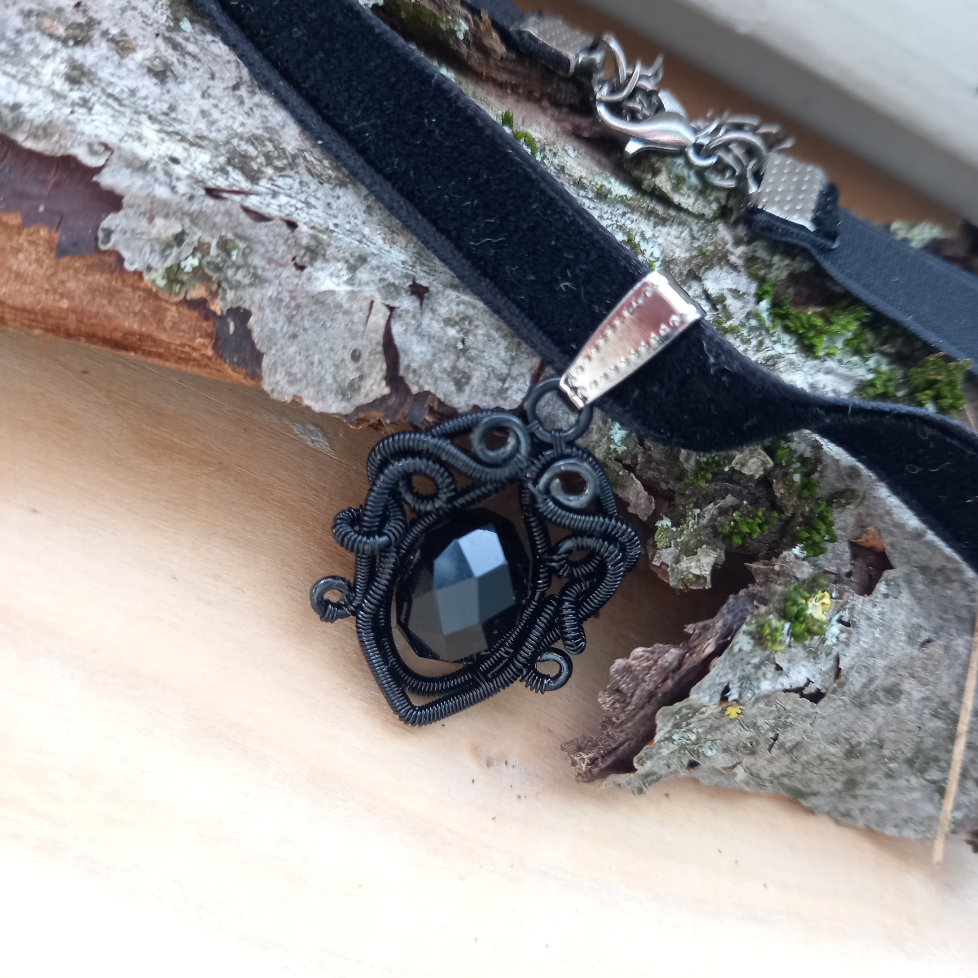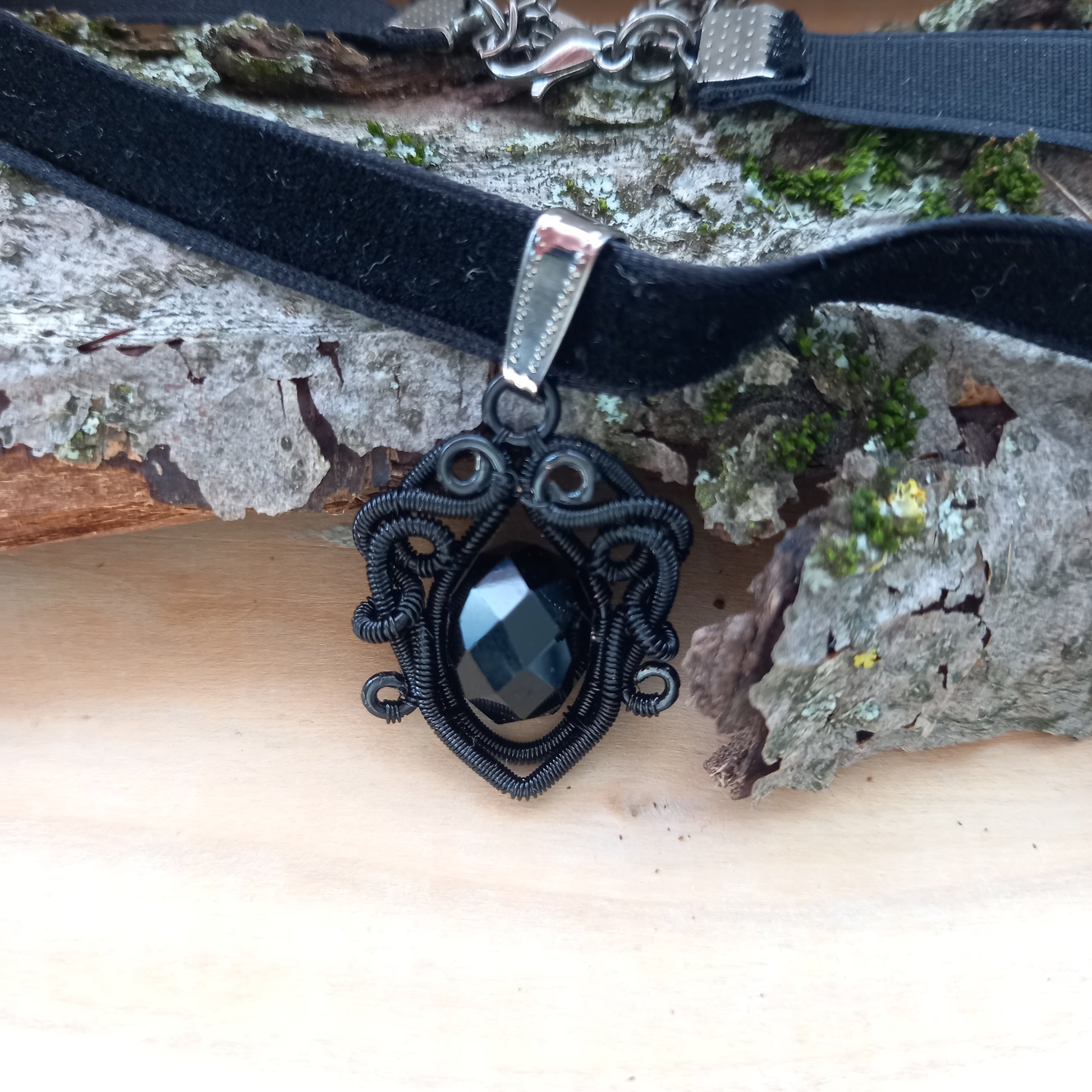 A medált fekete bevonatos rézdrótbólkészítettem fekete kristálygyönggyel.