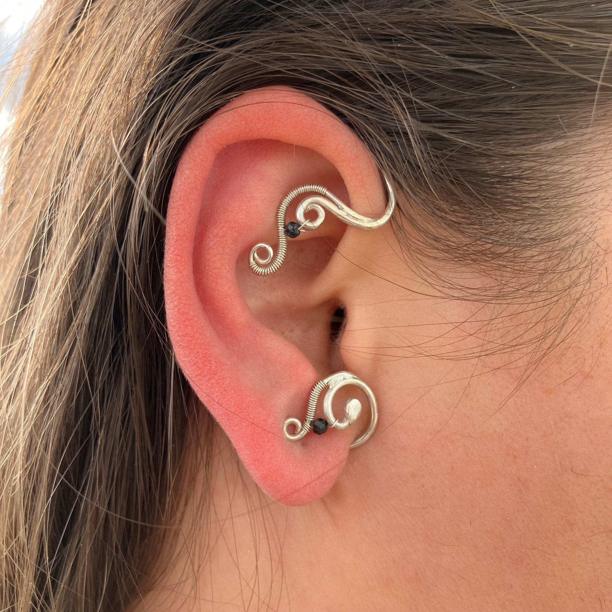 925 sterling silver ear wrap with black/green tourmaline beads