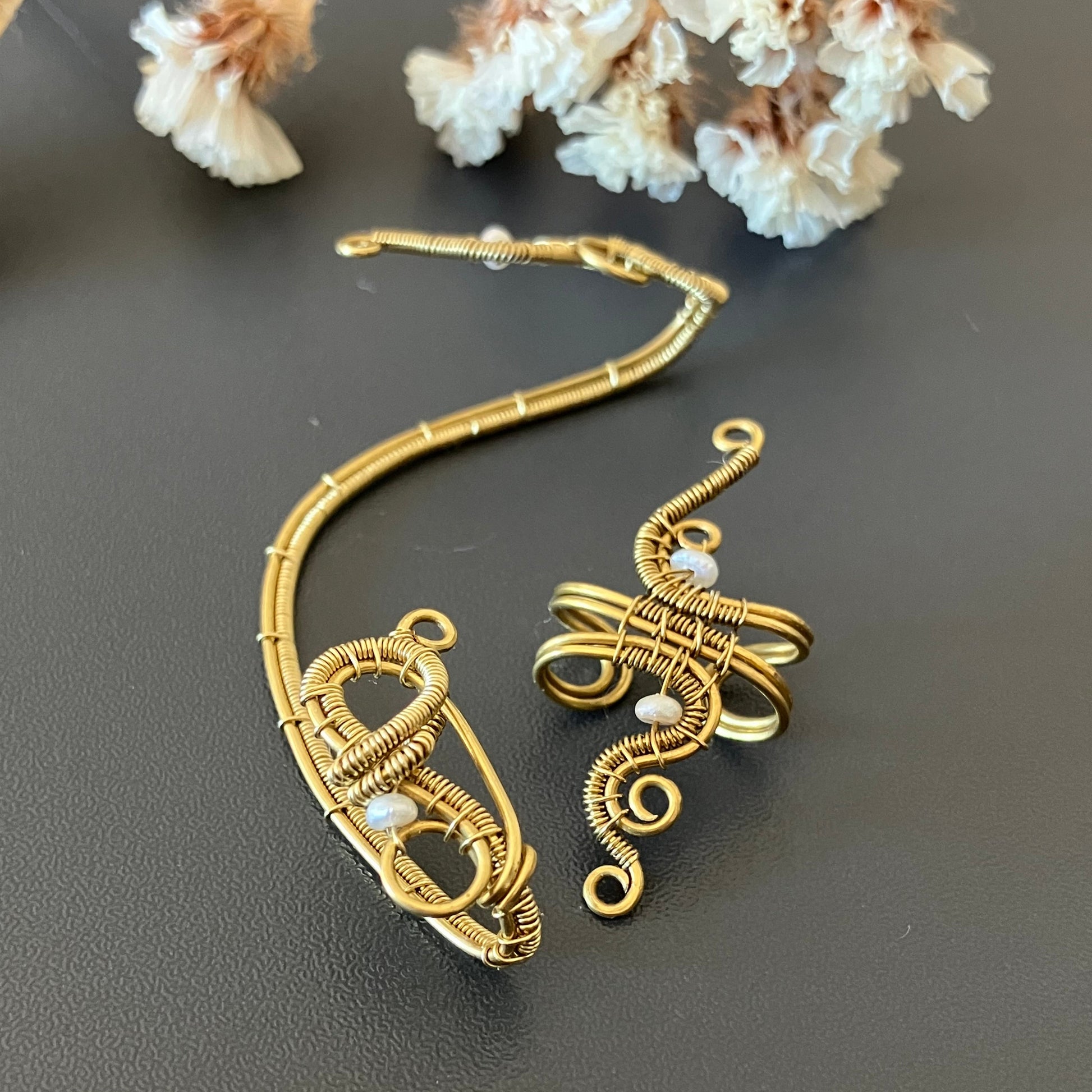 Brass and freshwater pearl no piercing ear cuff and ear wrap bundle.