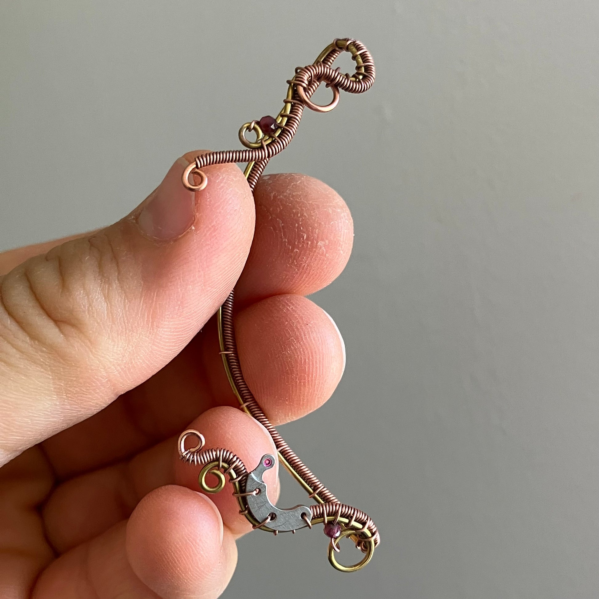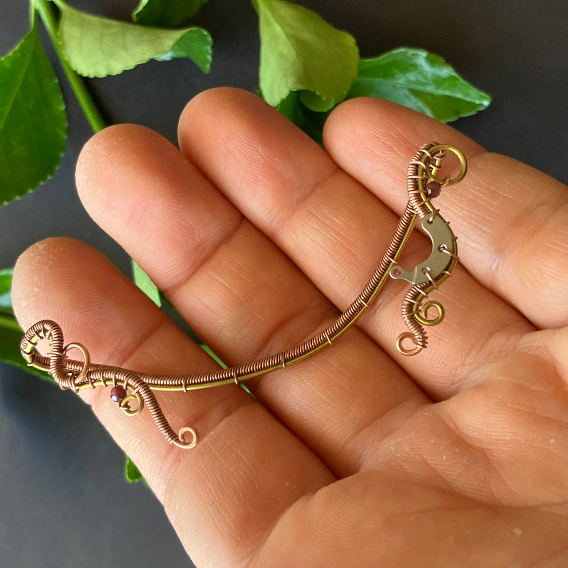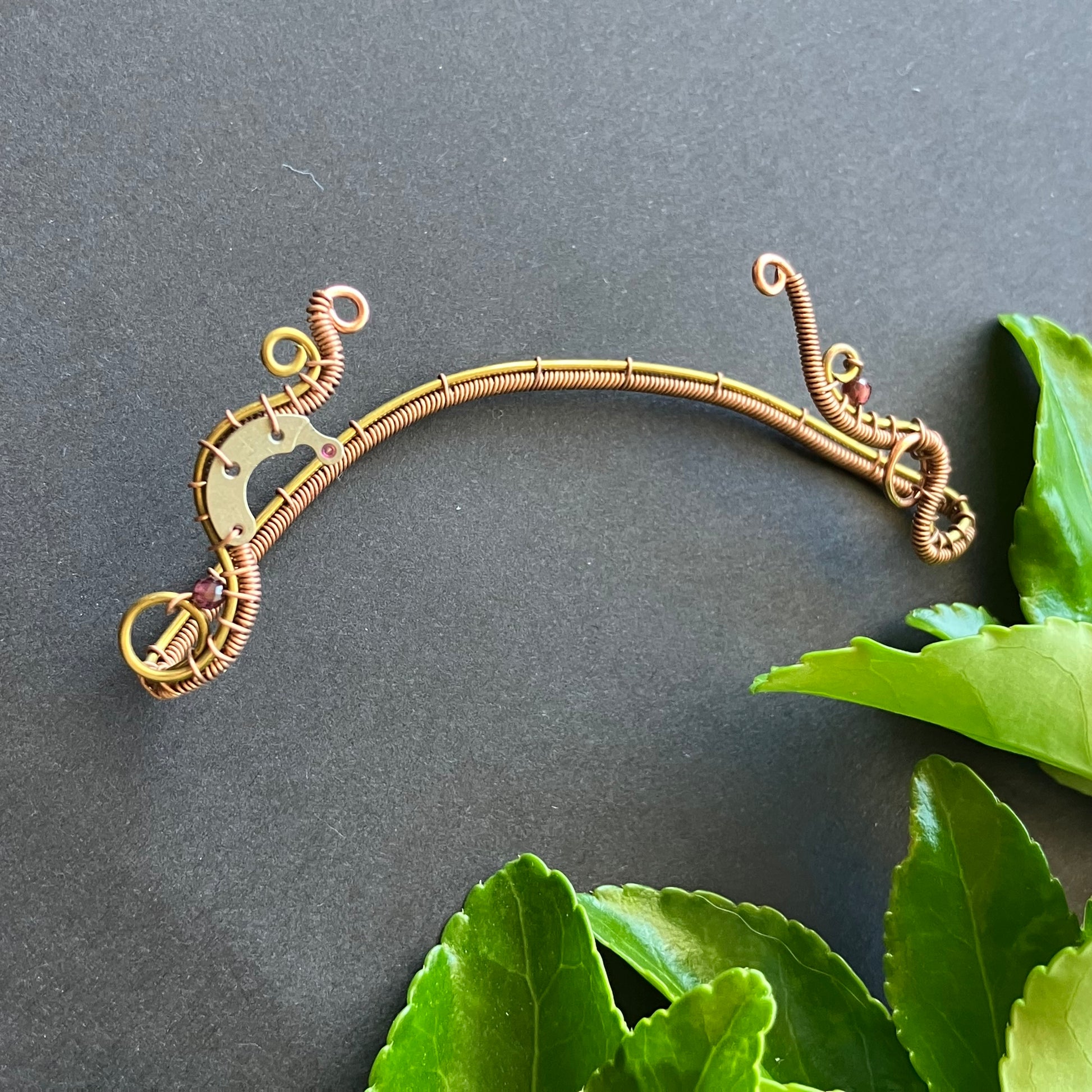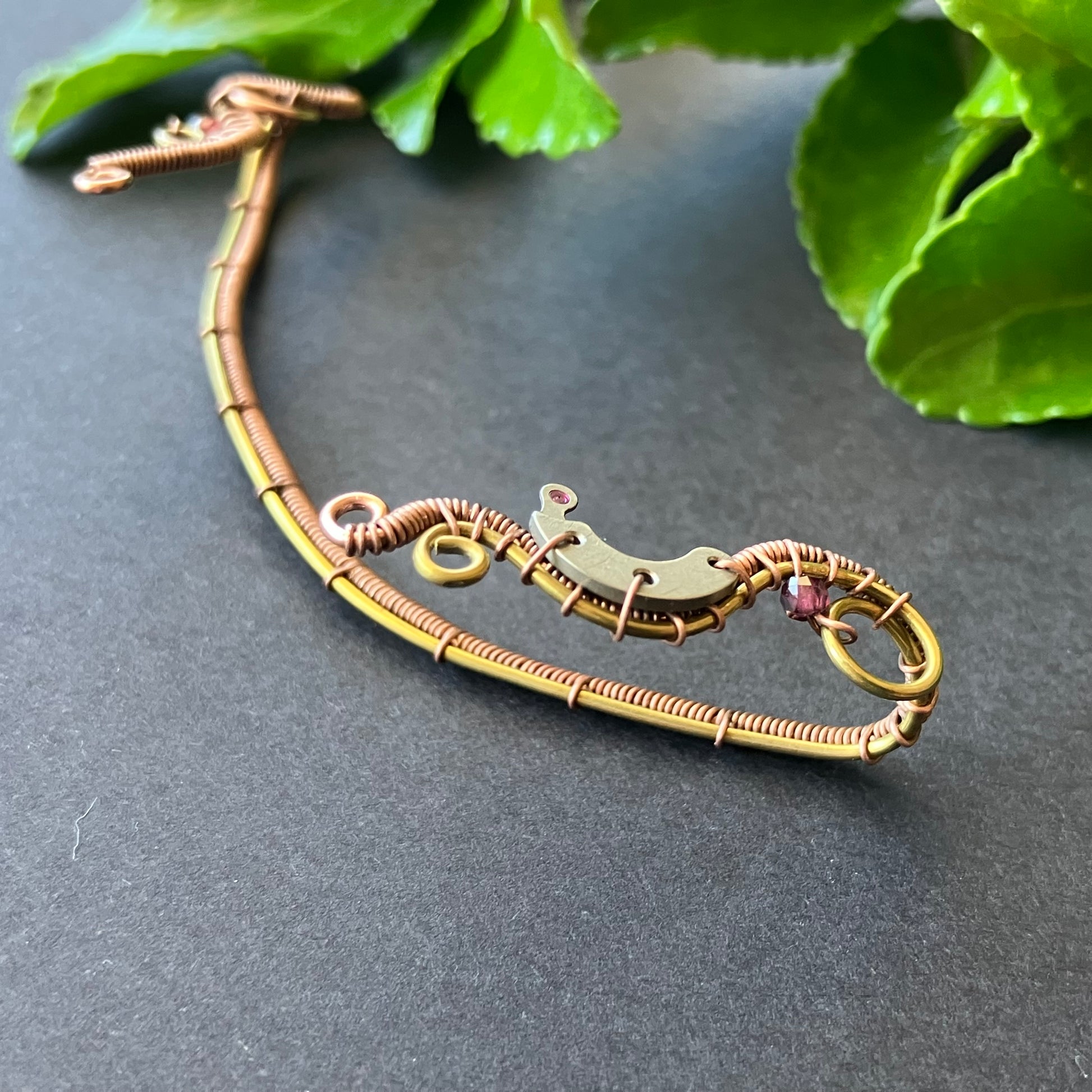 Brass and copper steampunk ear wrap with garnet