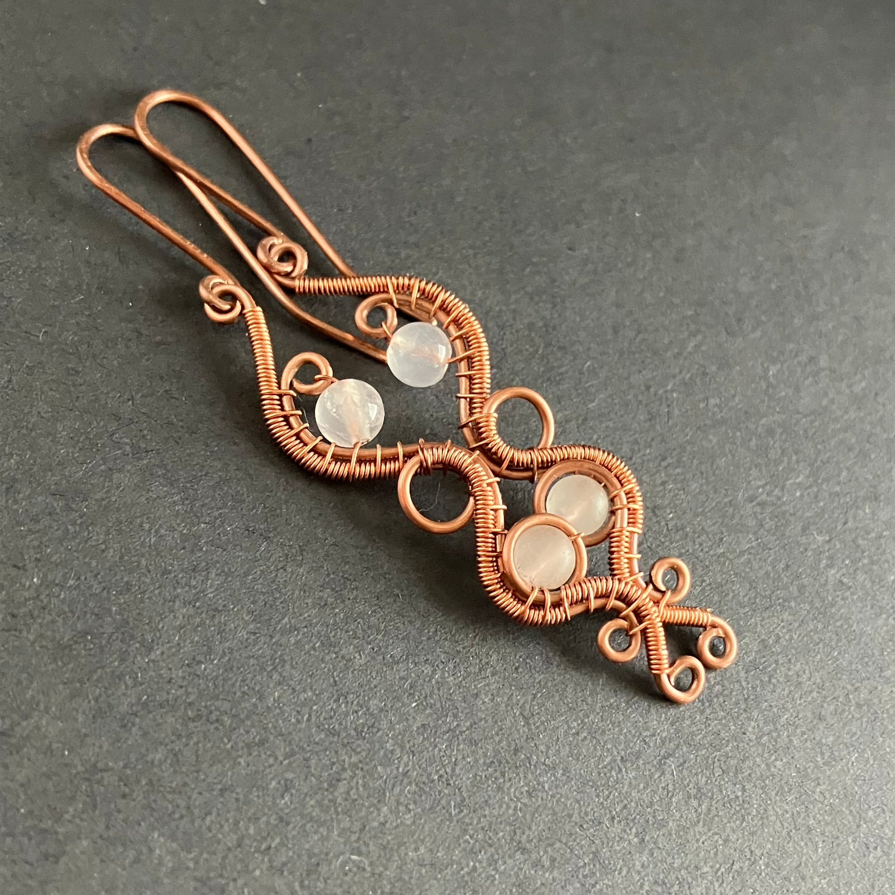 This piece is made with wire wrapping technique from copper wire with rose quartz beads.