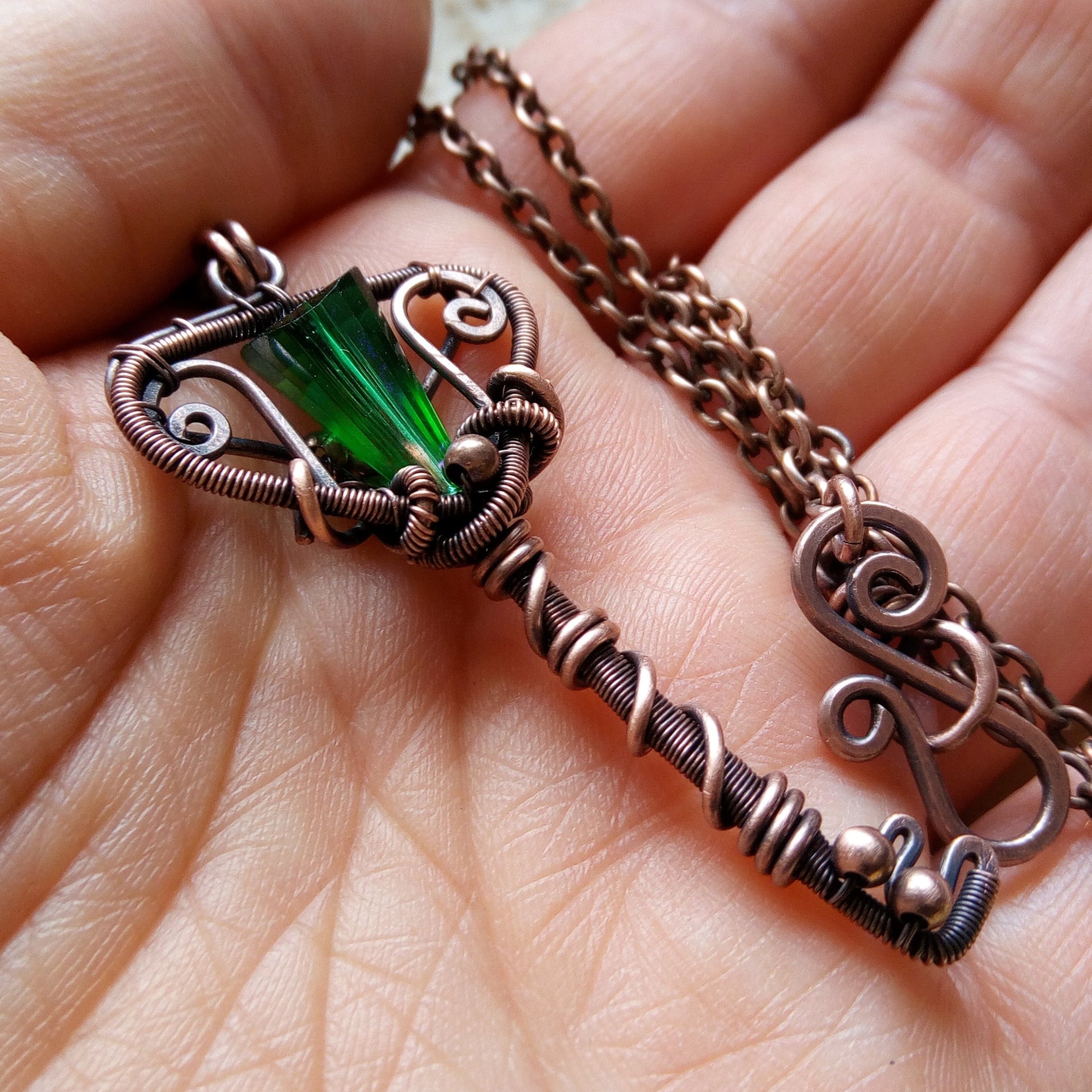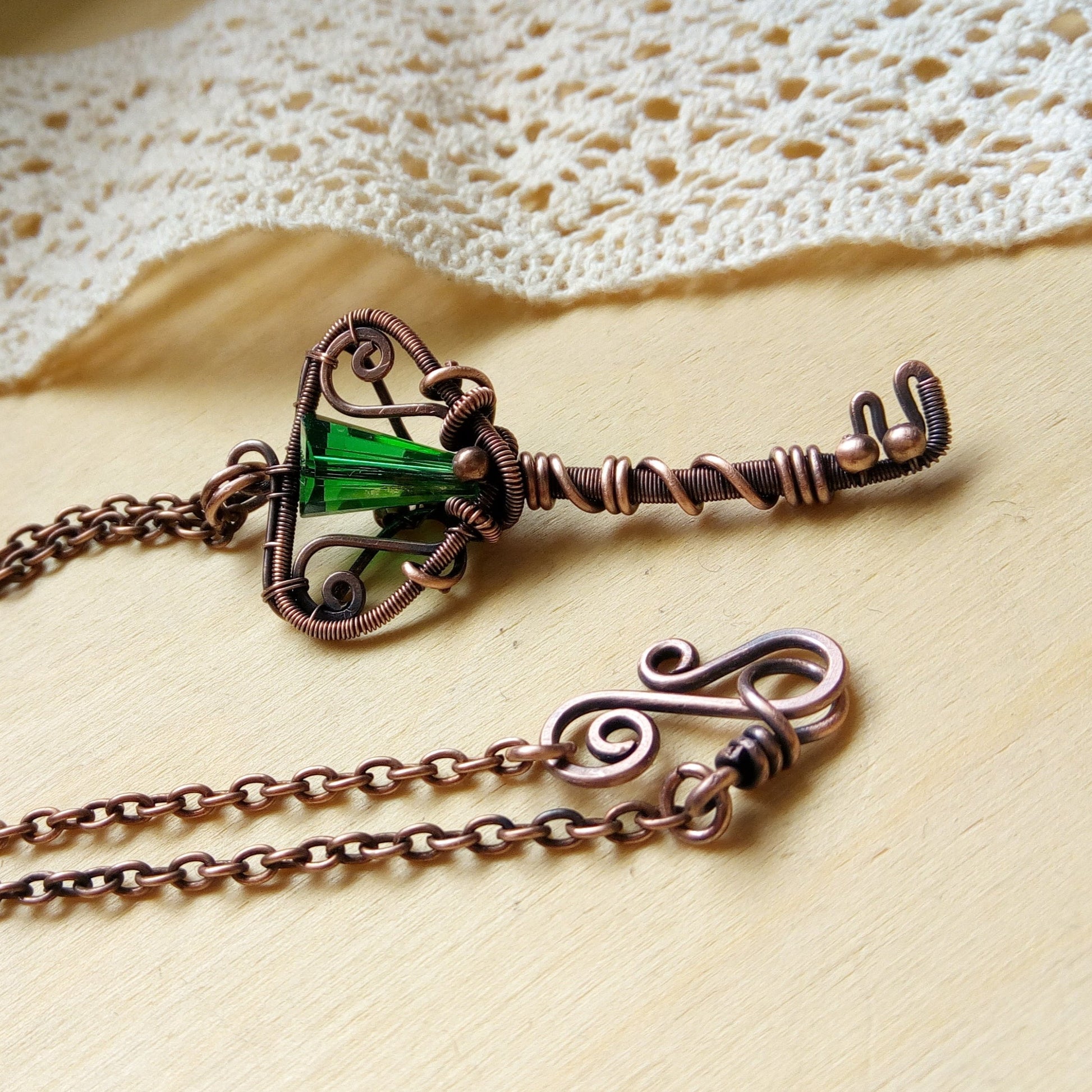 Copper and green key-shaped pendant.