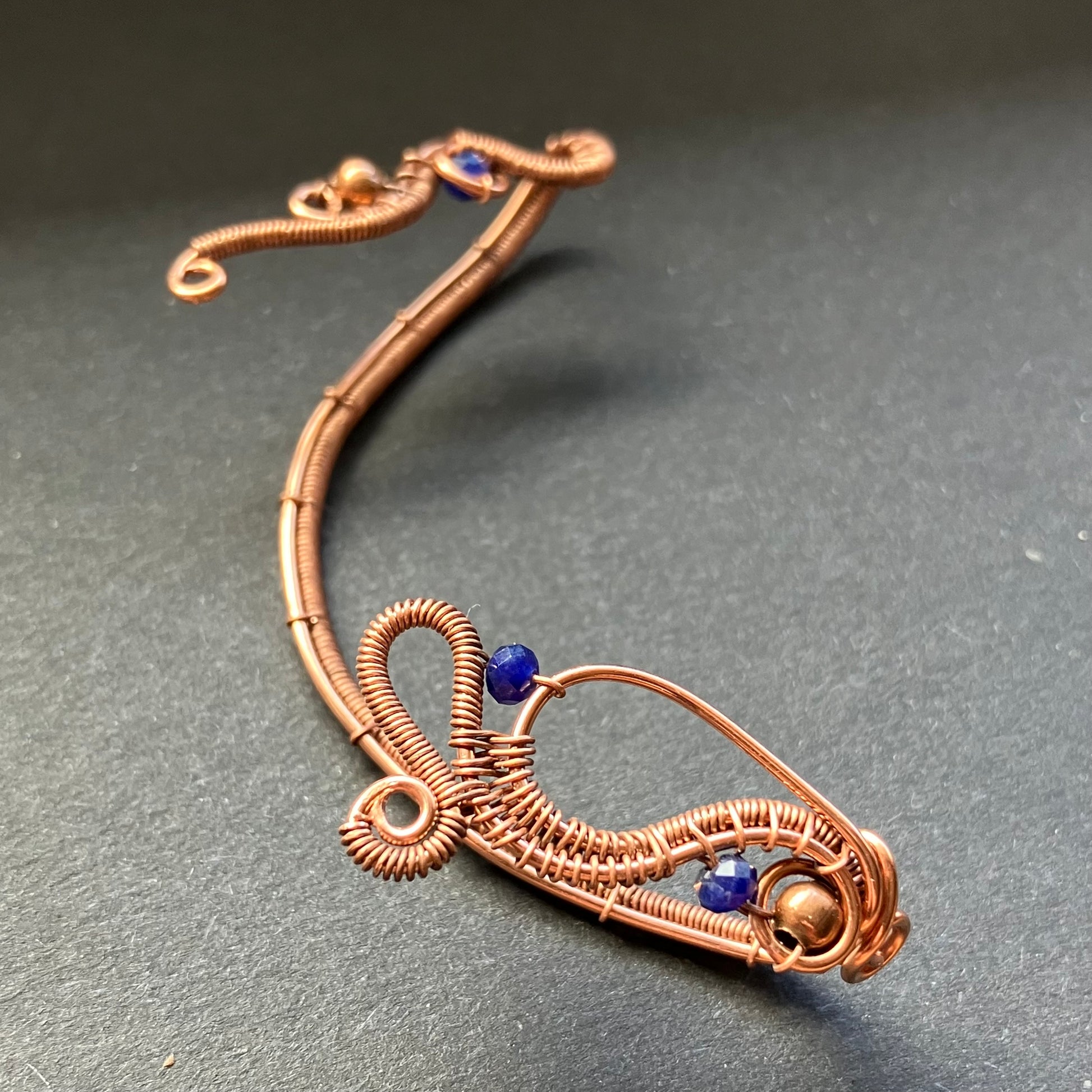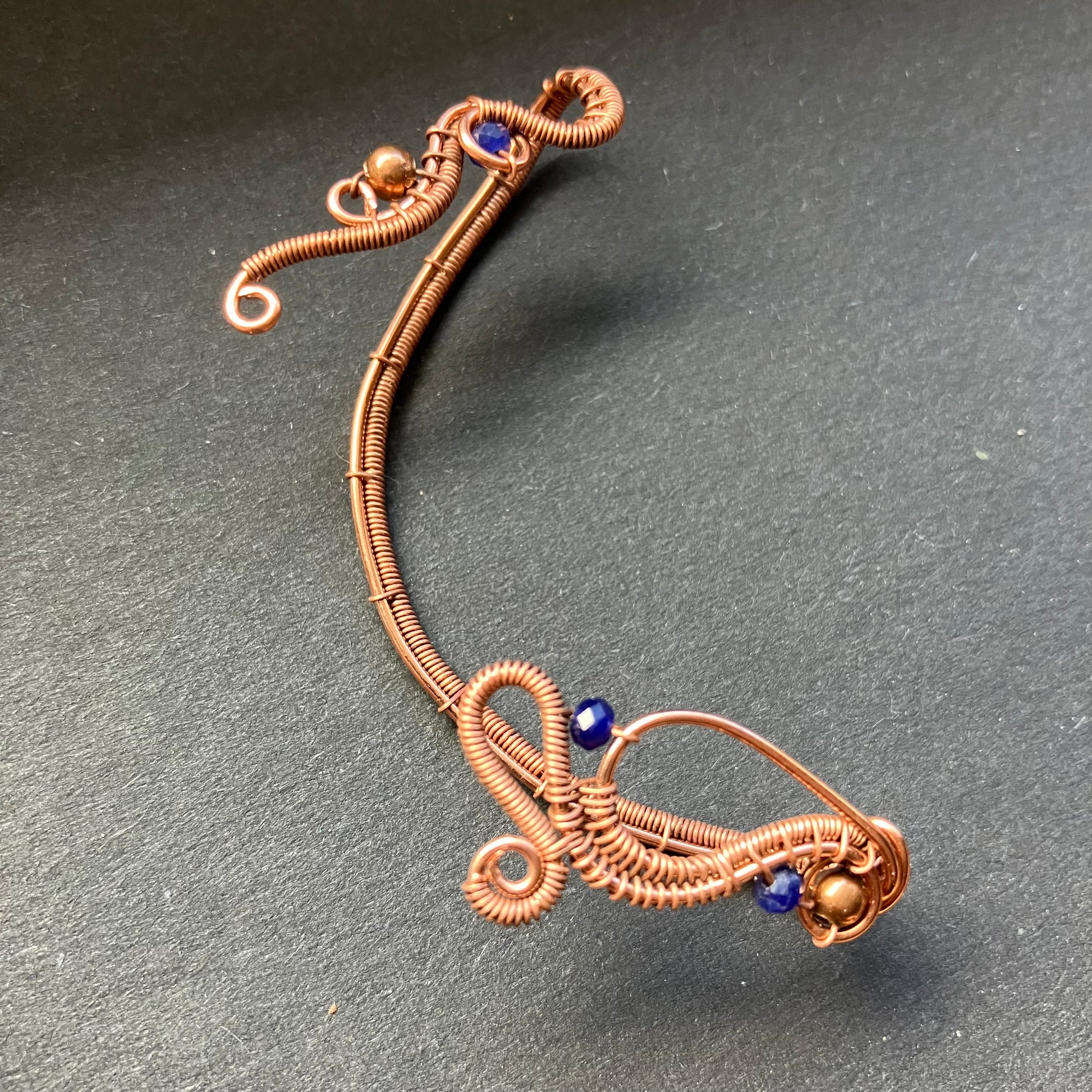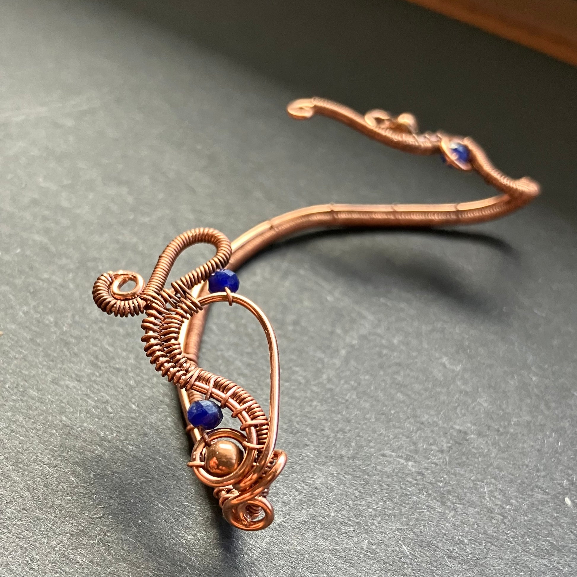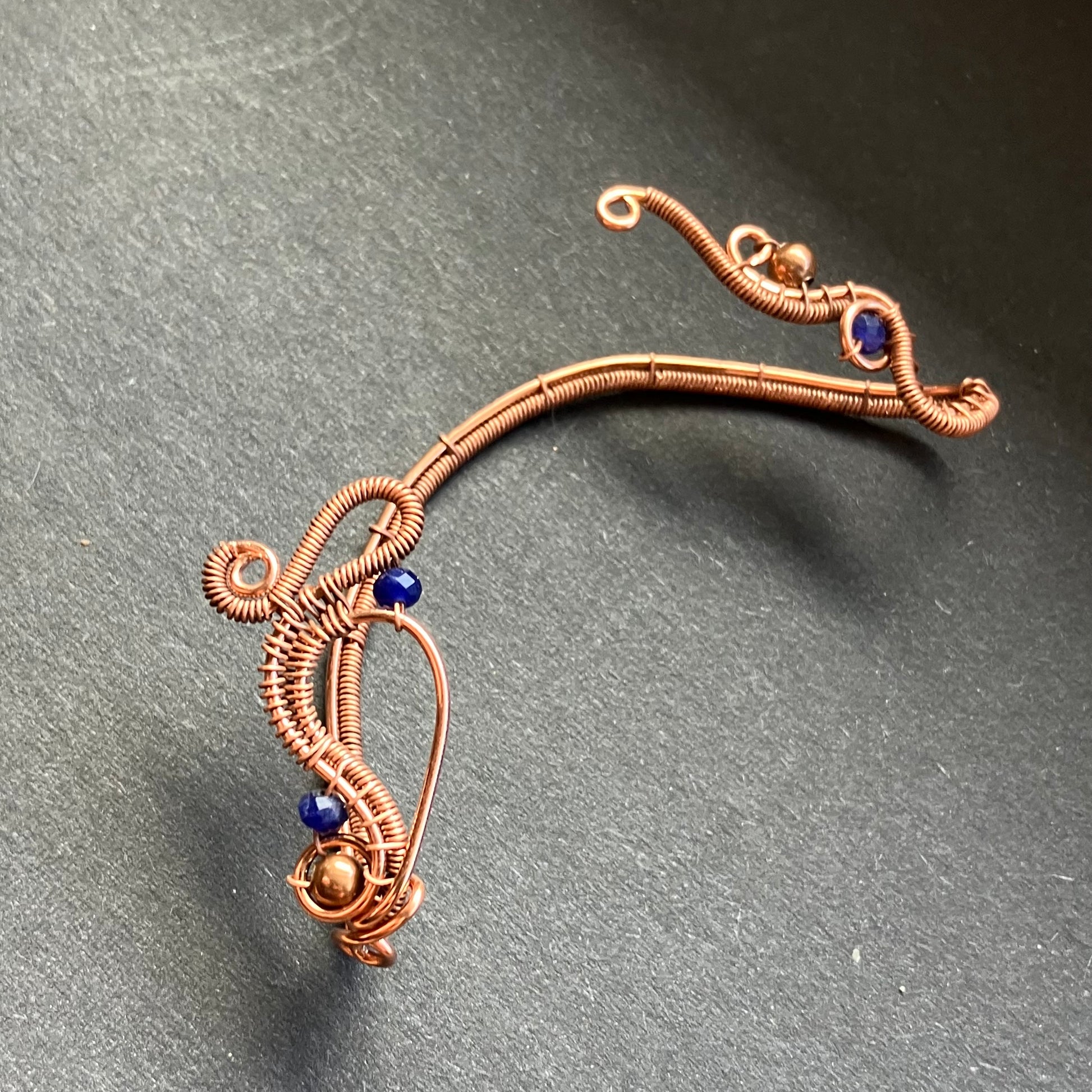 Wire wrapped copper ear wrap adorned with metal beads and sodalite stones.