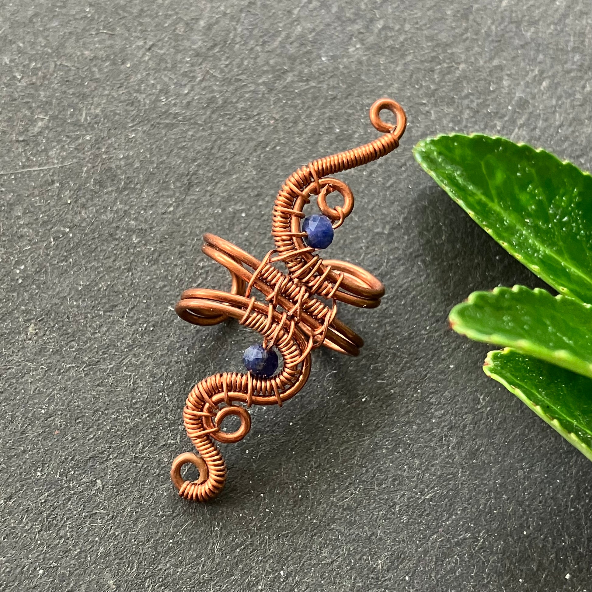 Made with wire wrapping technique using copper wire, adorning it with sodalite beads.