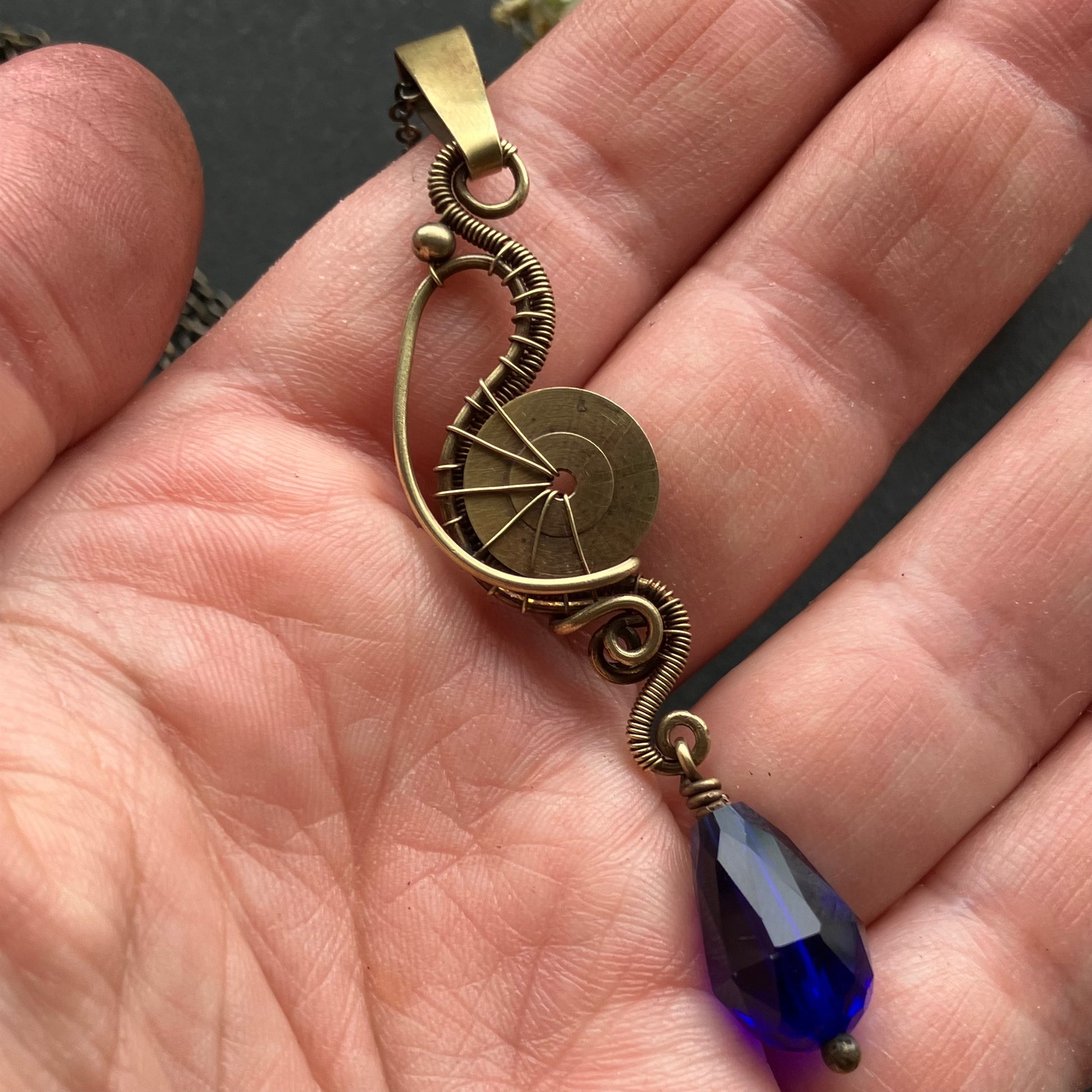 Brass pendant made with deep blue crystal bead and a cogwheel.