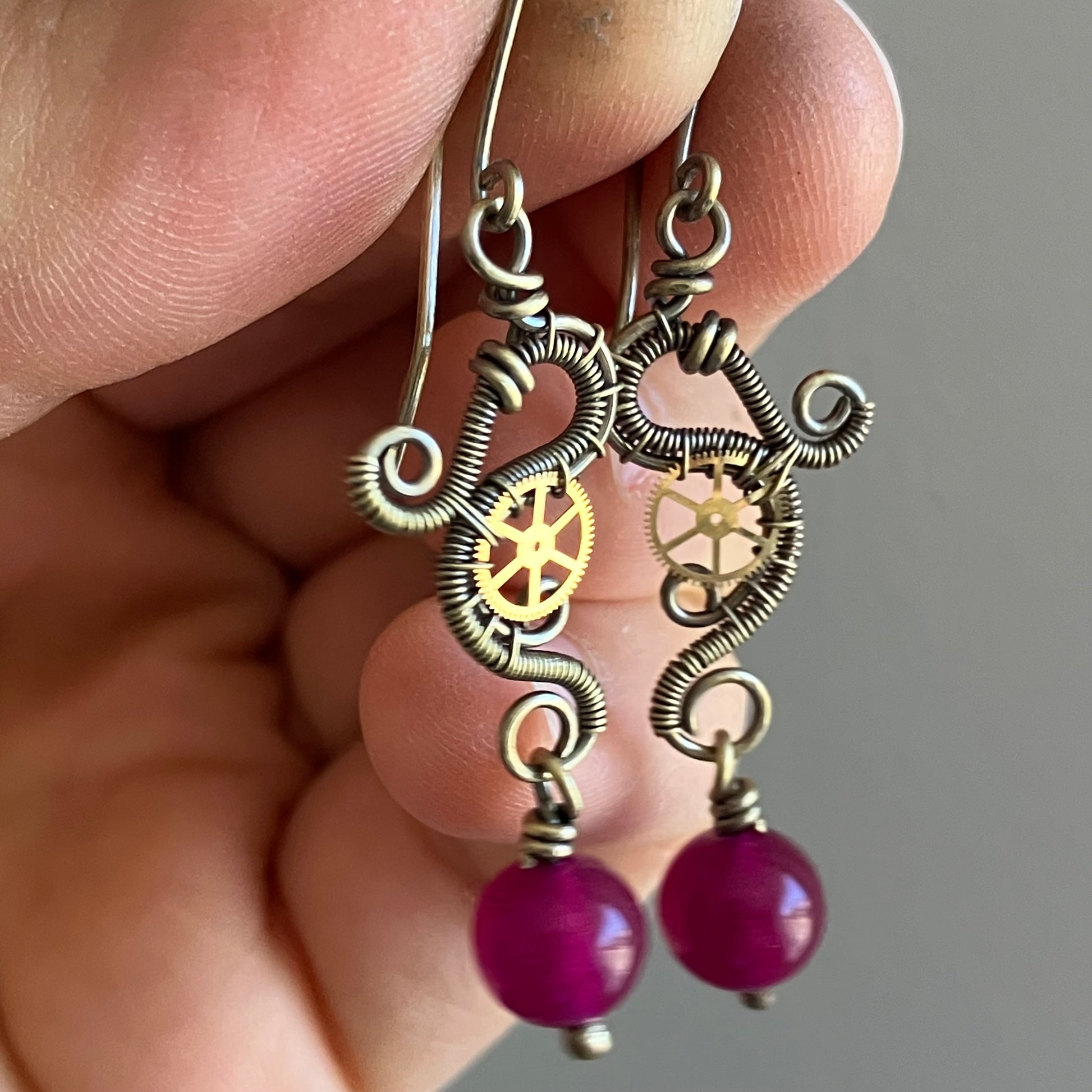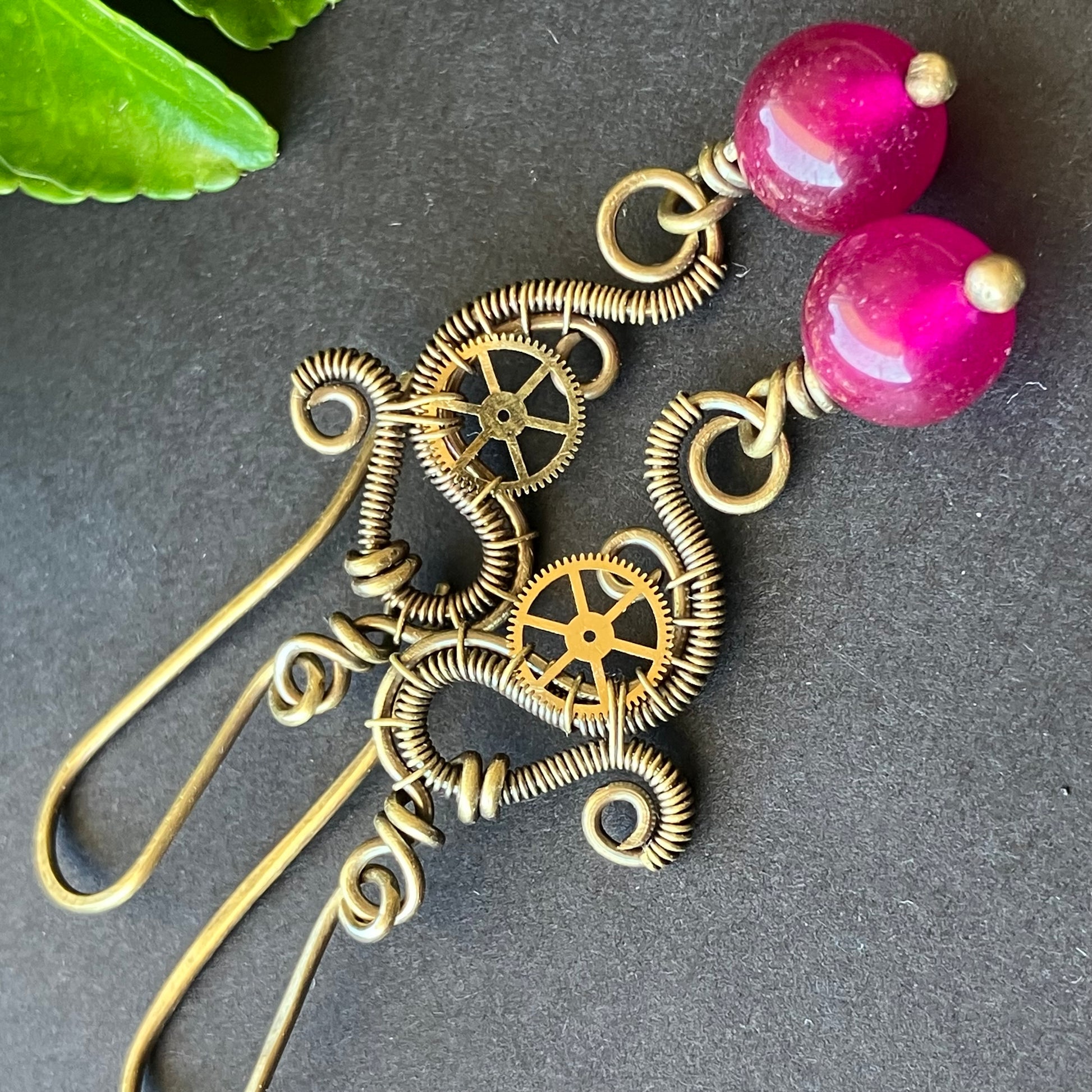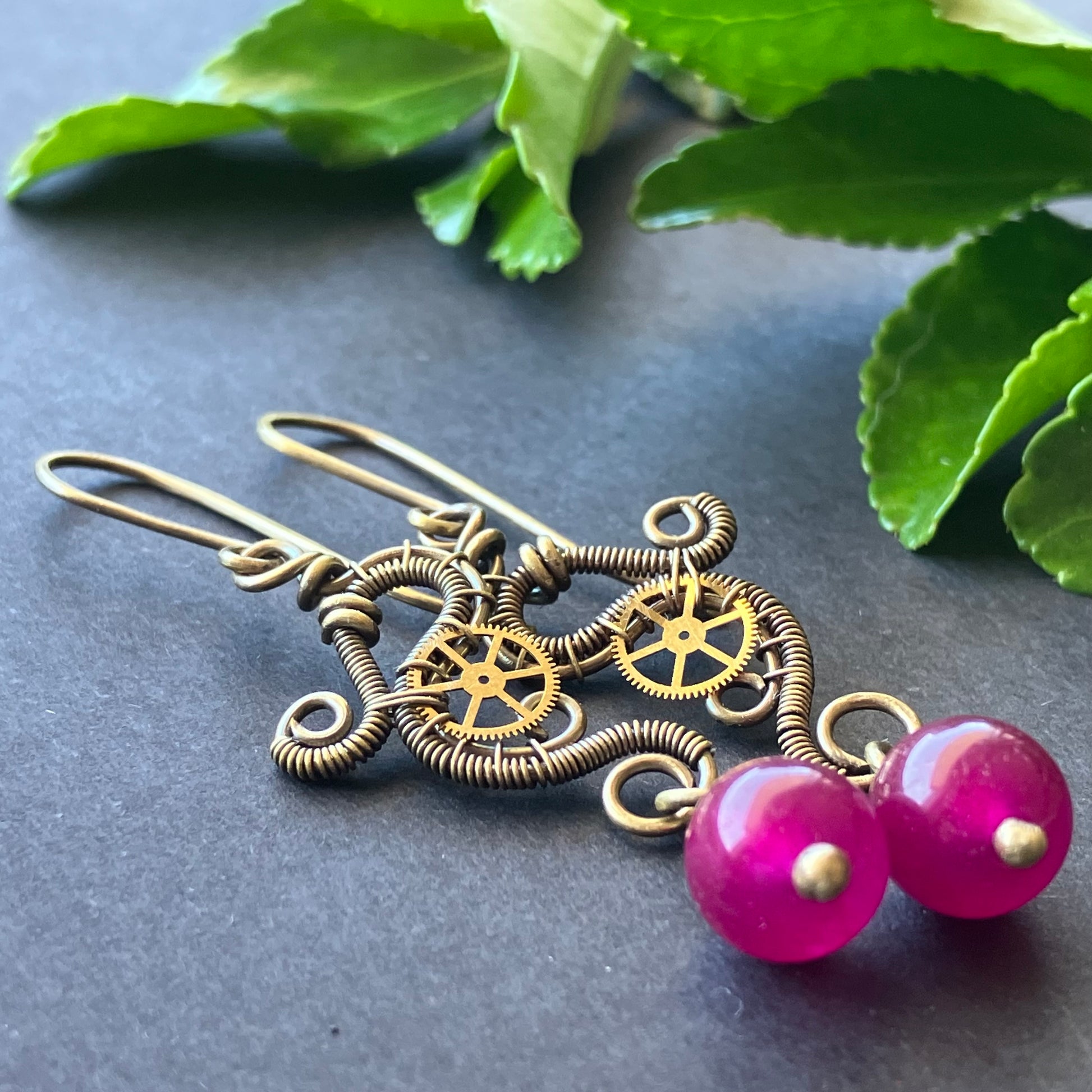 Wire wrapped steampunk earring. I made the jewelry out of brass wire, gears and jade stones. The finished product is antiqued and polished, to give it that old look.
