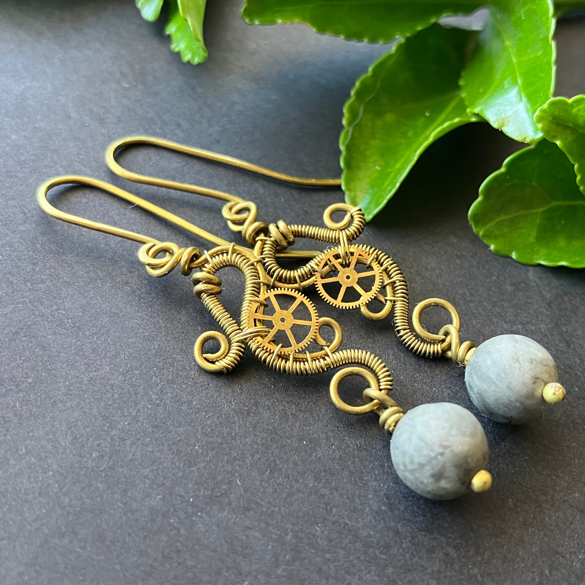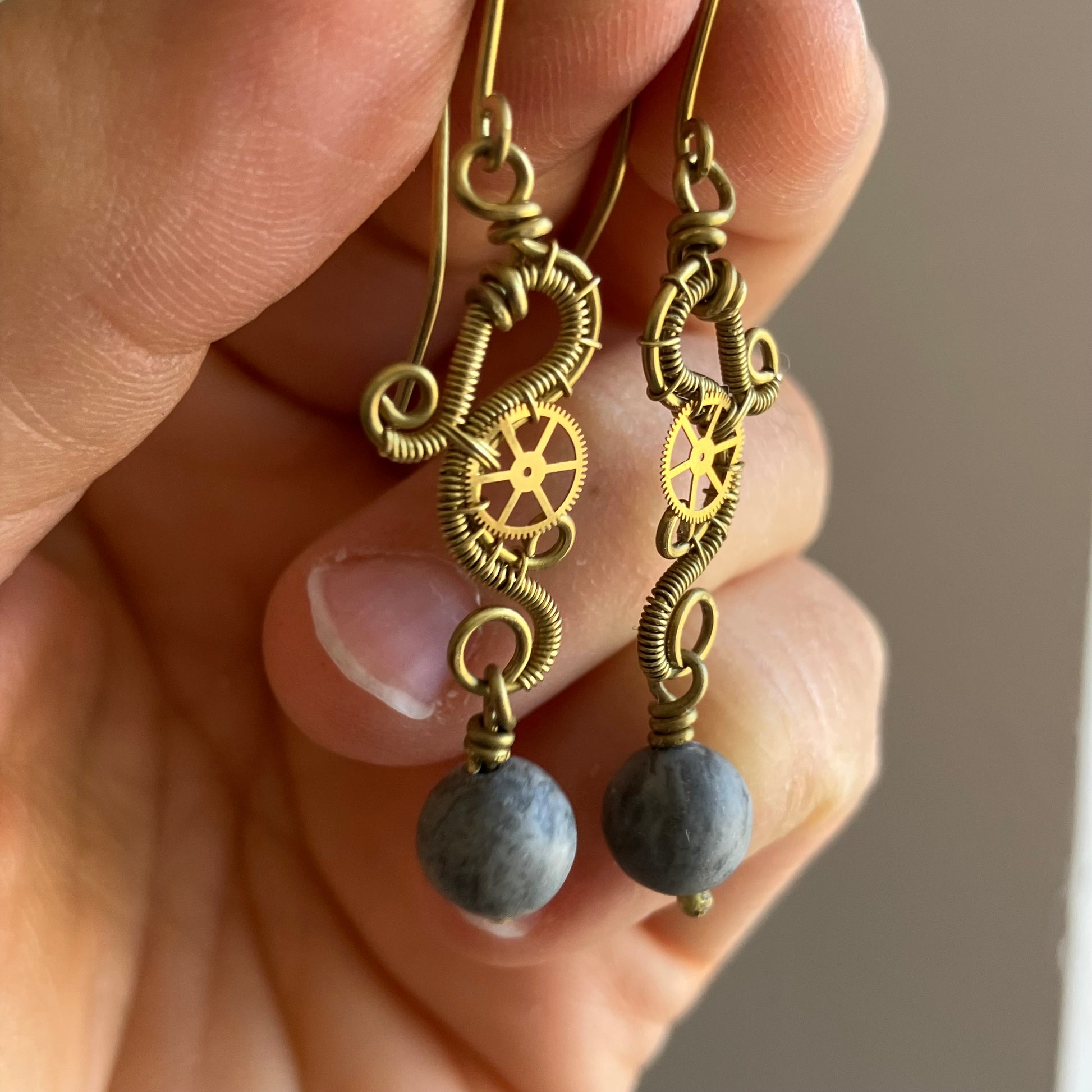 Wire wrapped steampunk earring. I made the jewelry out of brass wire, gears and landscape jasper stones. The finished product is antiqued and polished, to give it that old look.