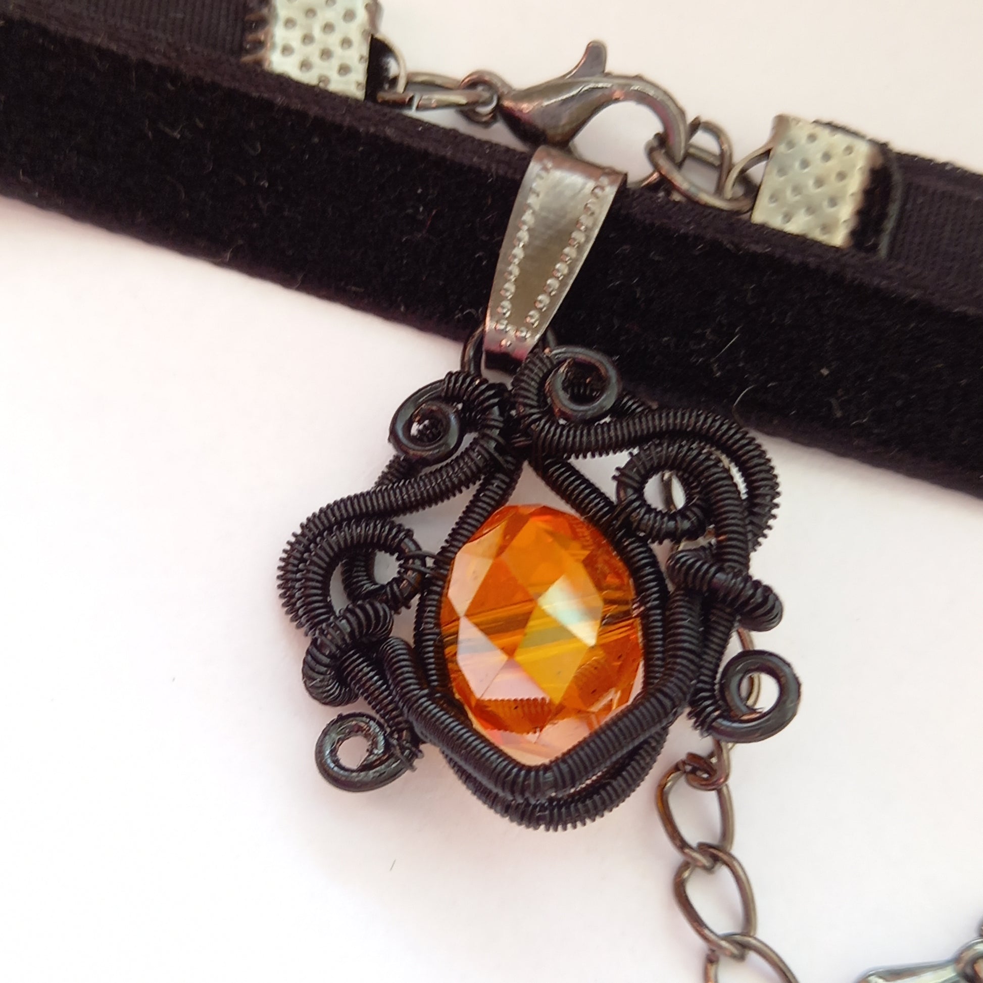Black velvet choker with orange and black wire wrapped pendant.