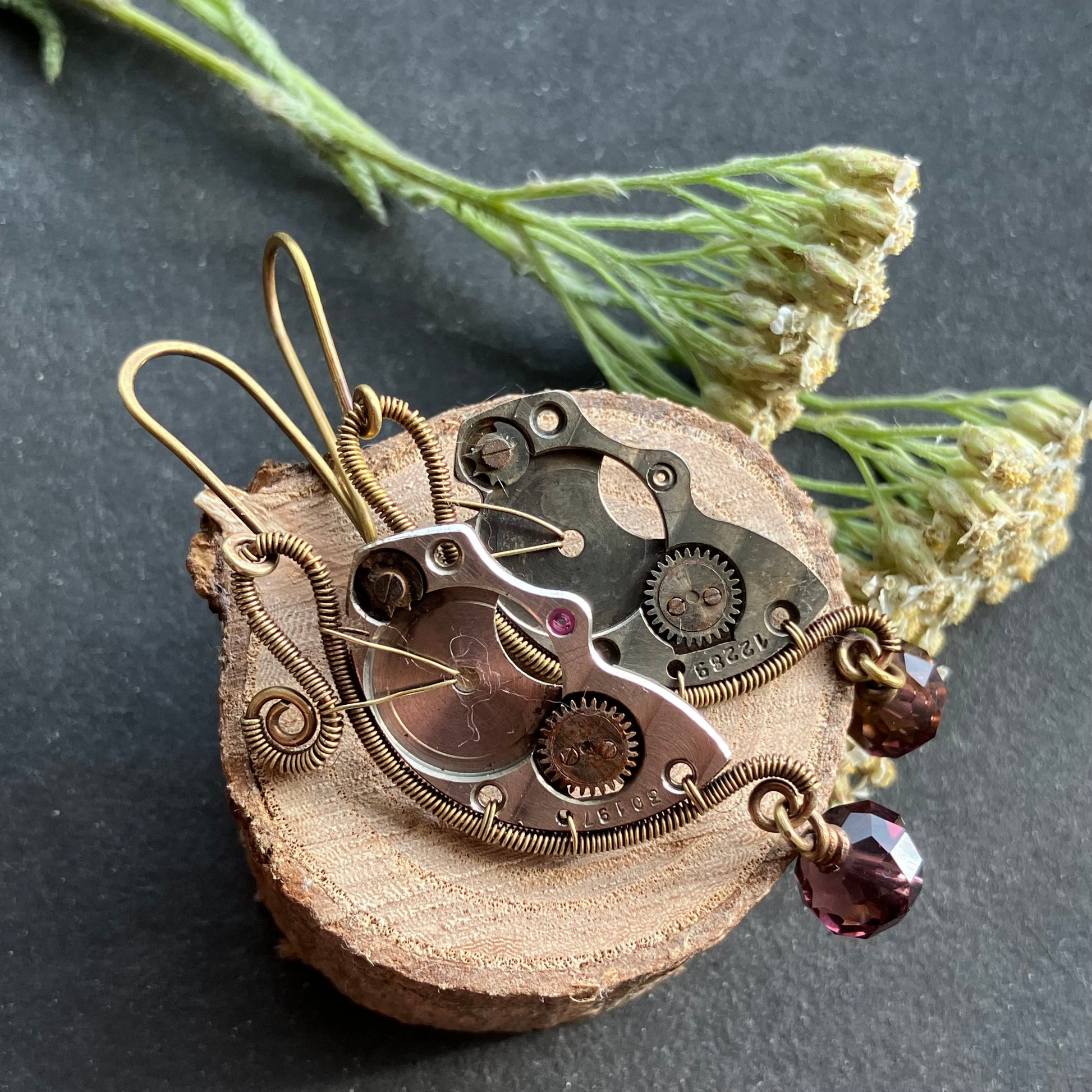 REINA steampunk brass clockwork and purple earrings