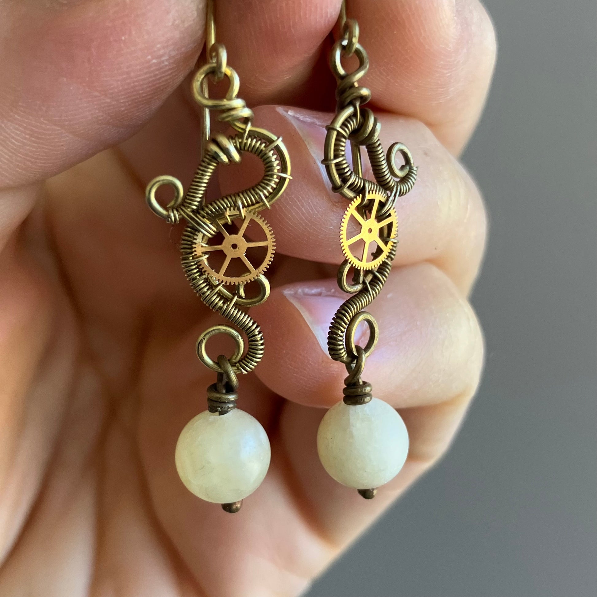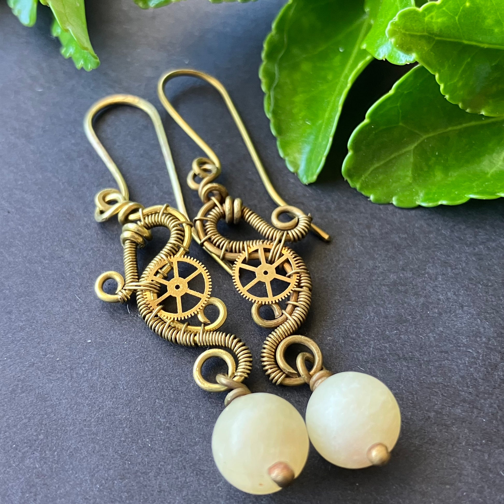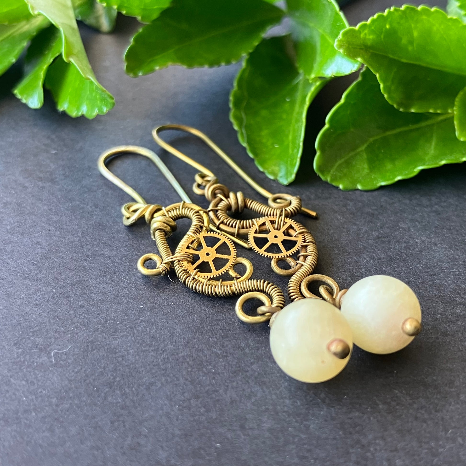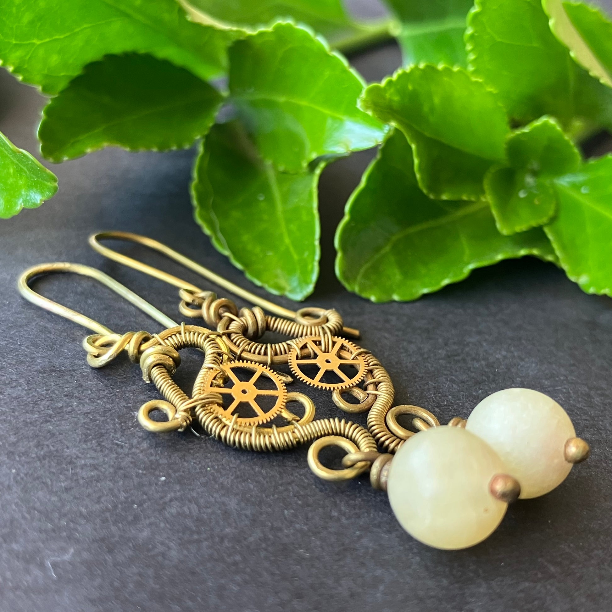 Made with wire wrapping technique using brass wire, adorning it with small gears and yellow jade beads.