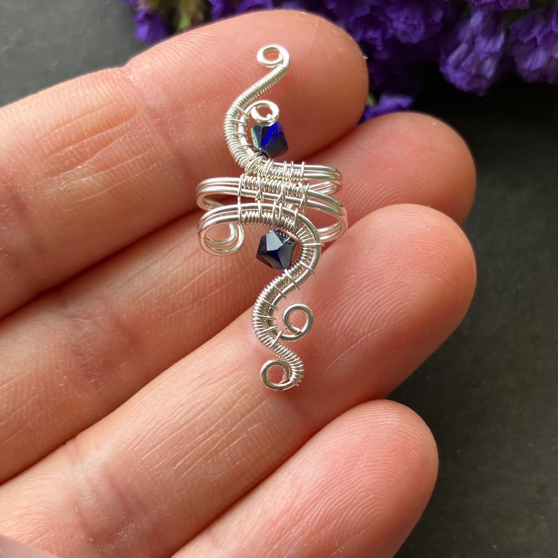 Silver plated no piercing ear cuff with dark blue glass beads.