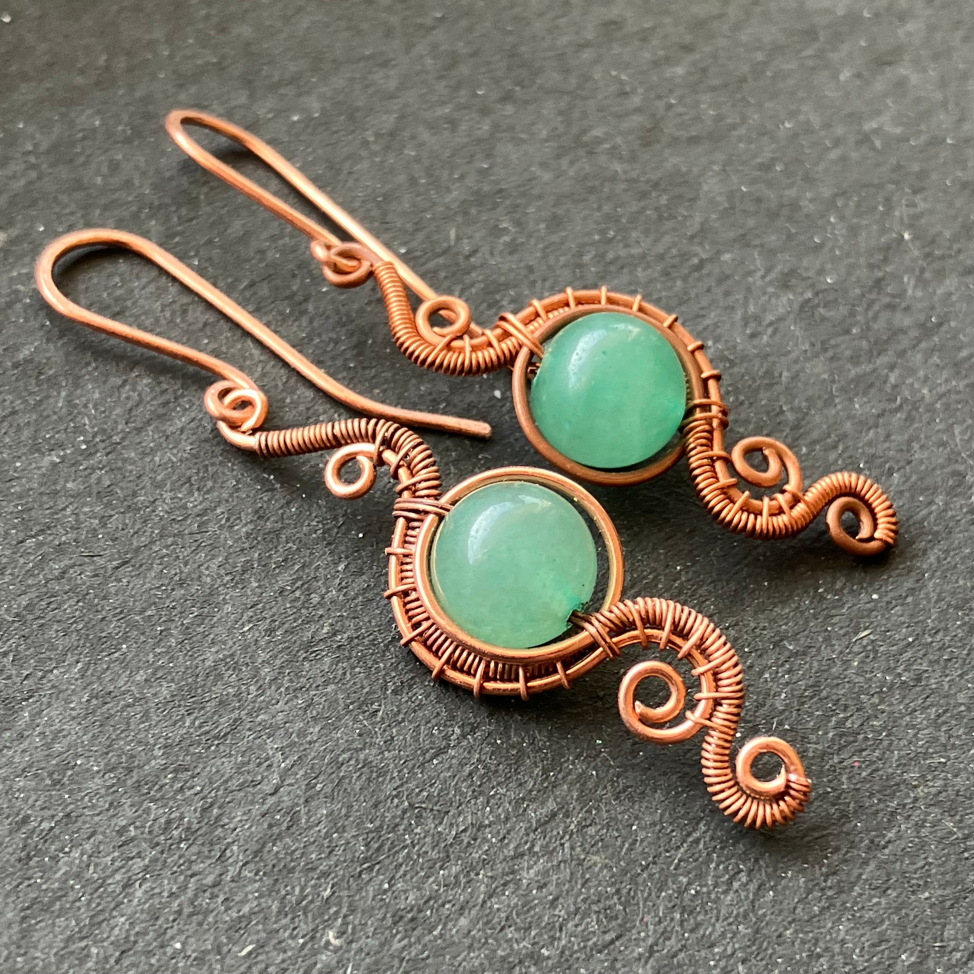 Aventurine earring made with copper wire.
