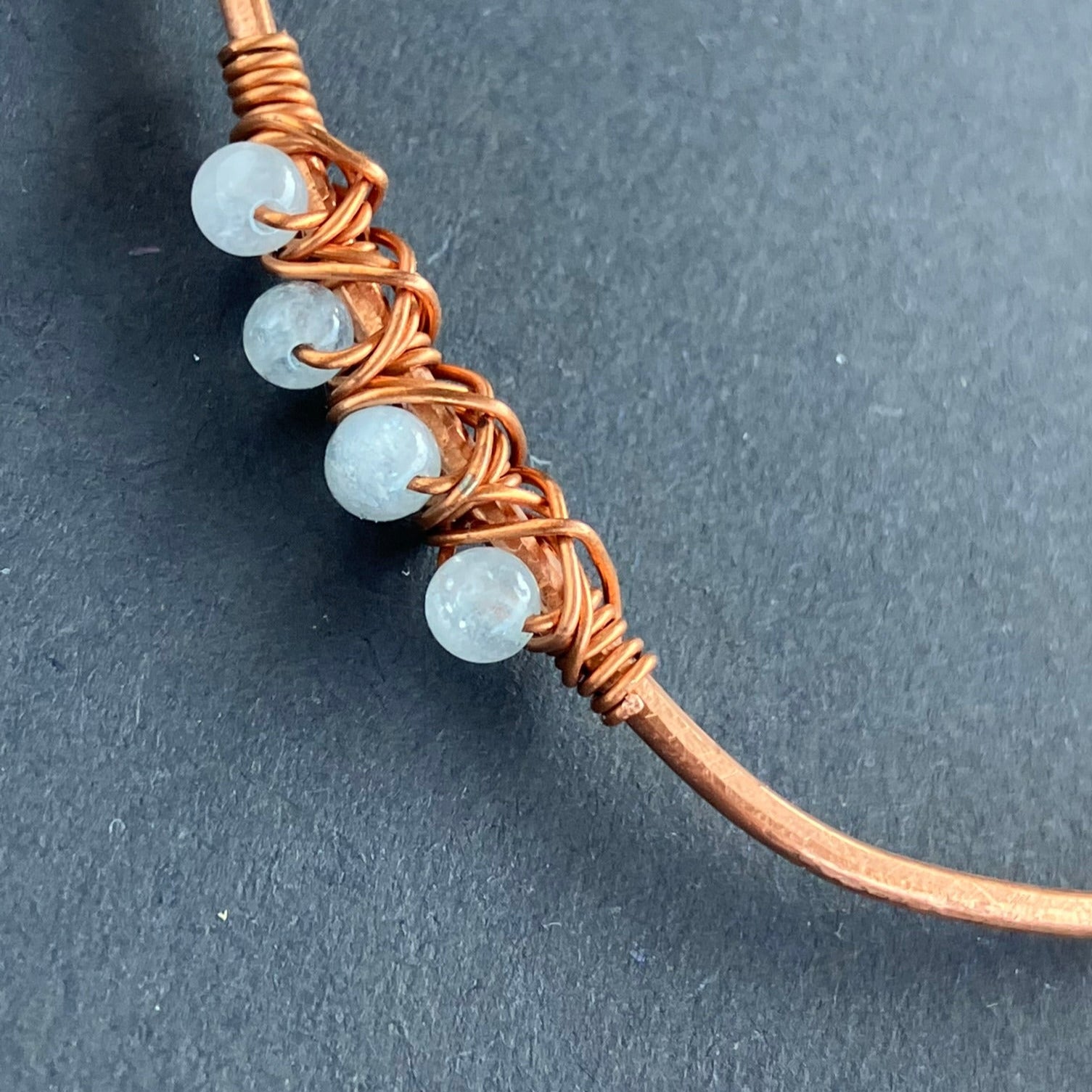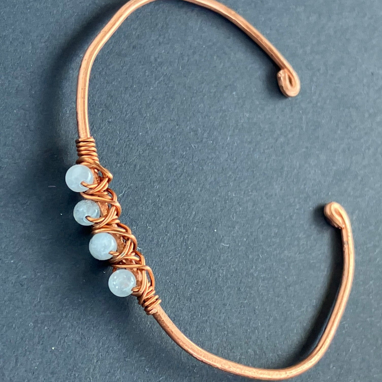 Made with wire wrapping technique using copper wire, adorning it with aquamarine beads.