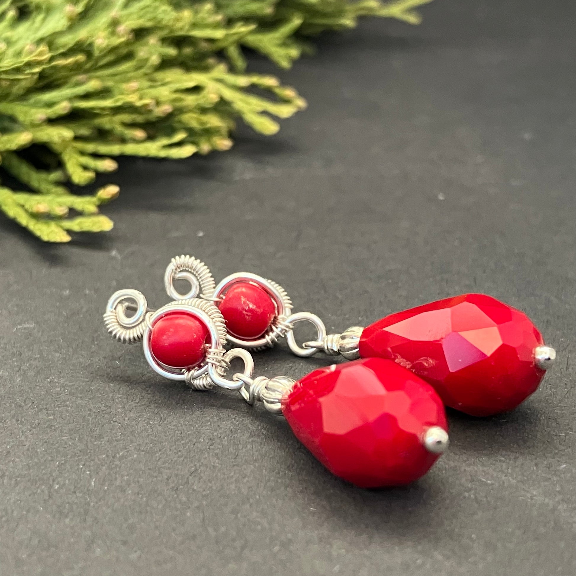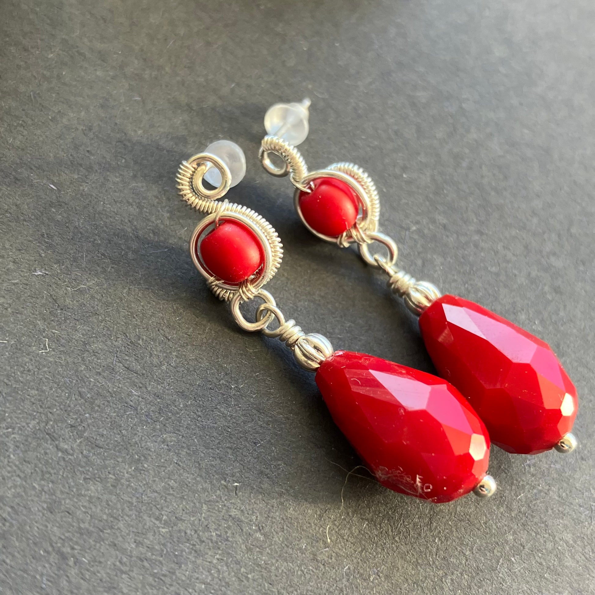 Wire wrapped earrings made of silver plated copper wire and red glass beads.